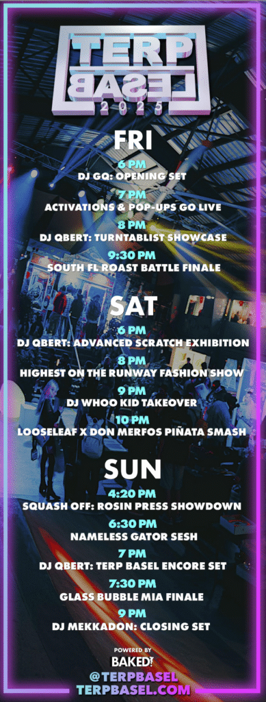 Terp Basel is the ultimate celebration of cannabis culture, art, music, fashion, skateboarding, and technology. This three-night extravaganza features a dynamic lineup of live performances, exclusive brand activations, and mesmerizing art installations by renowned creators. Attendees can explore a vibrant marketplace filled with cutting-edge products, enjoy interactive activations, and engage with thought leaders in the industry from around the globe.